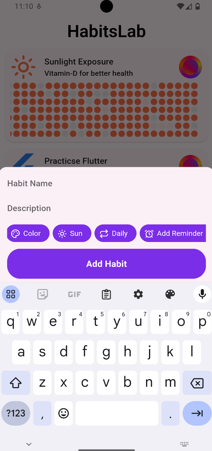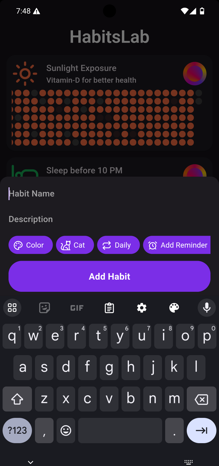 Create a habit with few taps. Just provide a name, choosing an icon or color is optional. Now tapping 'Add Habit', your habit is created. You can edit them later.