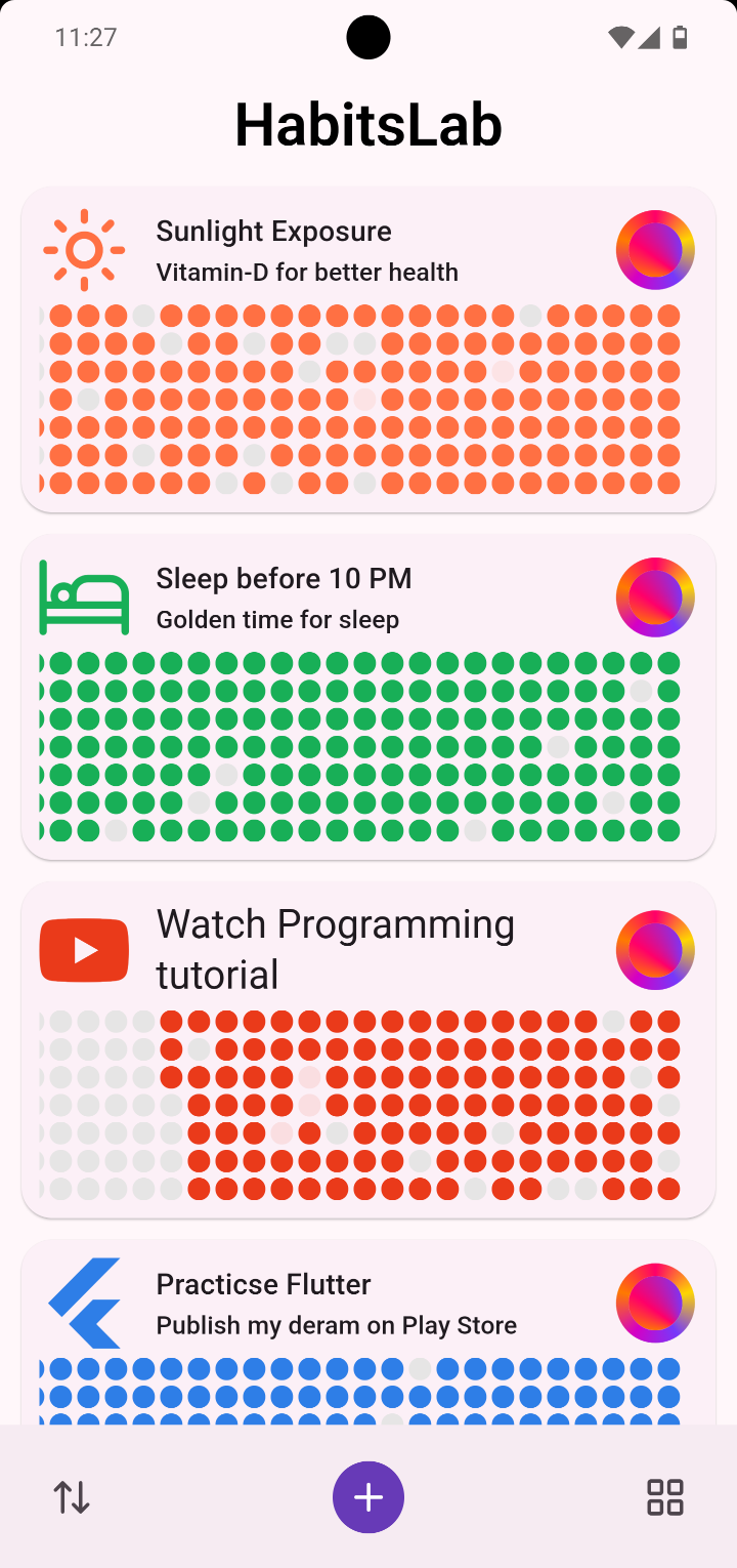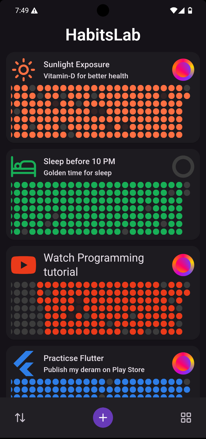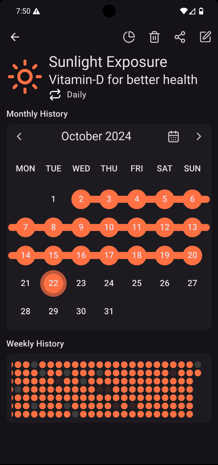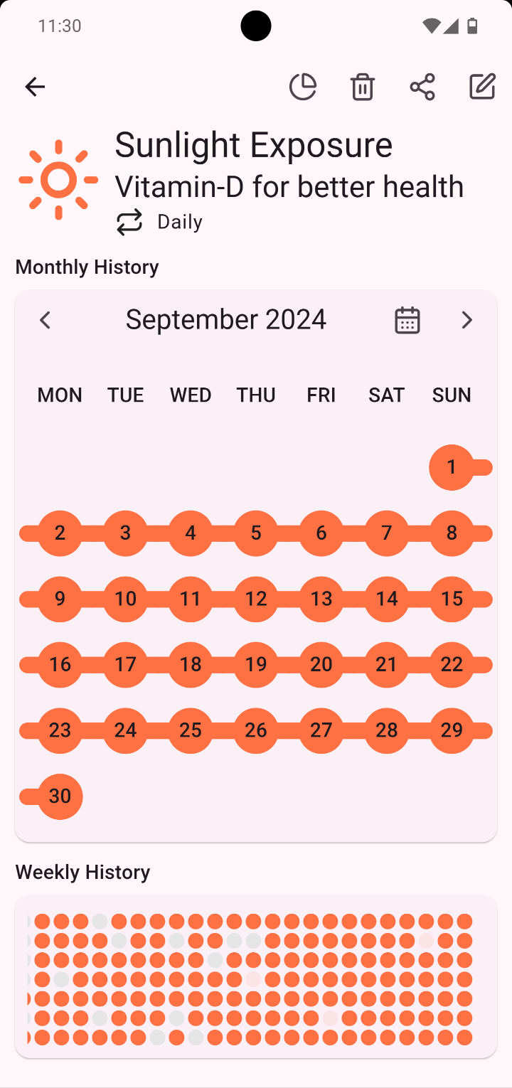 All of your active habits are displayed on your dashboard in weekly basis. A colored dot means you completed the habit on that day.