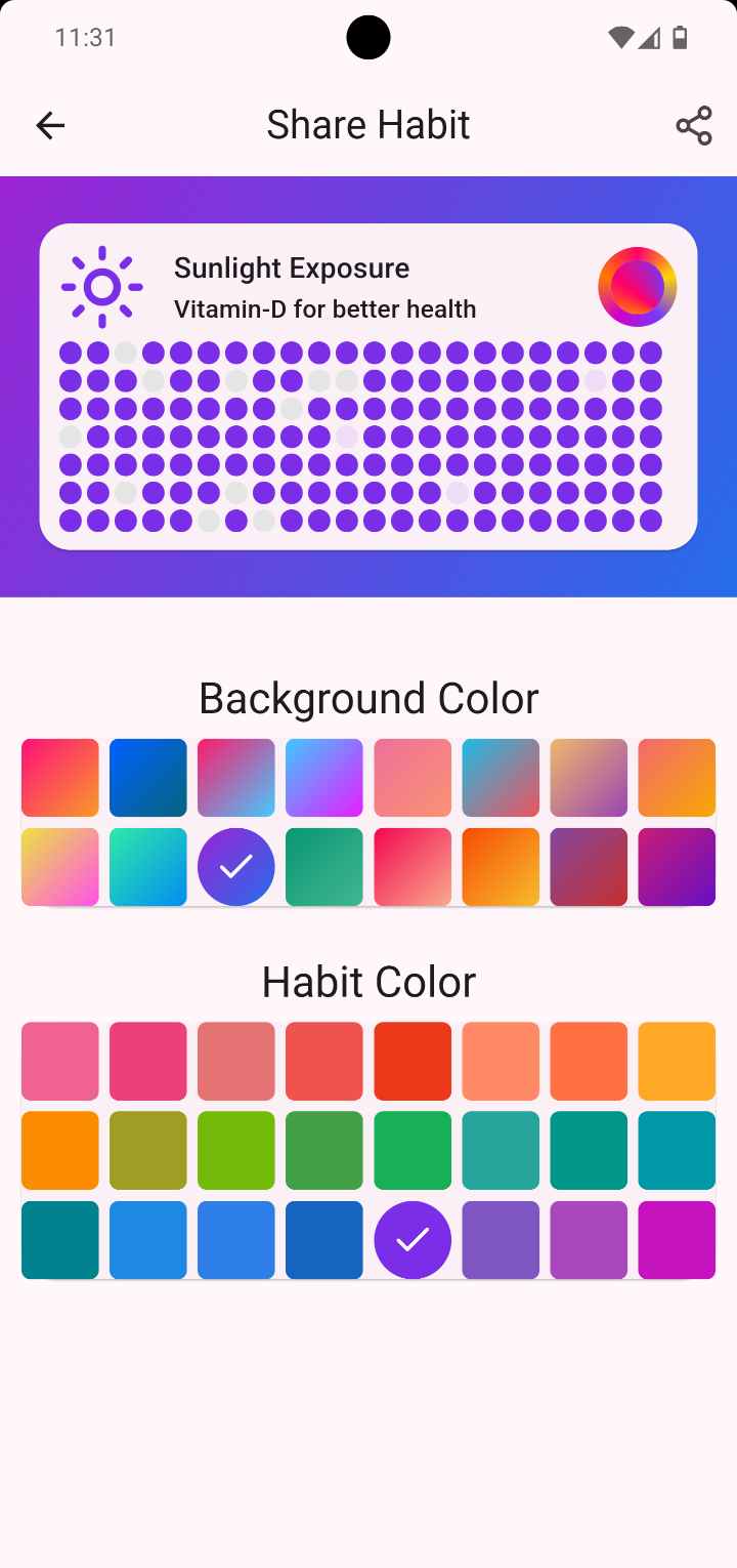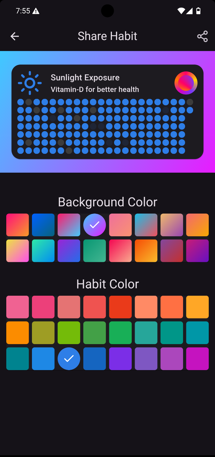 Generate an awesome image of your habit with nice background gradients and share your progress with others.