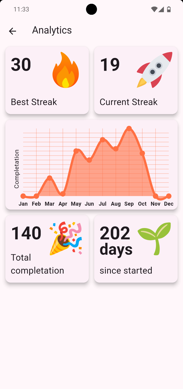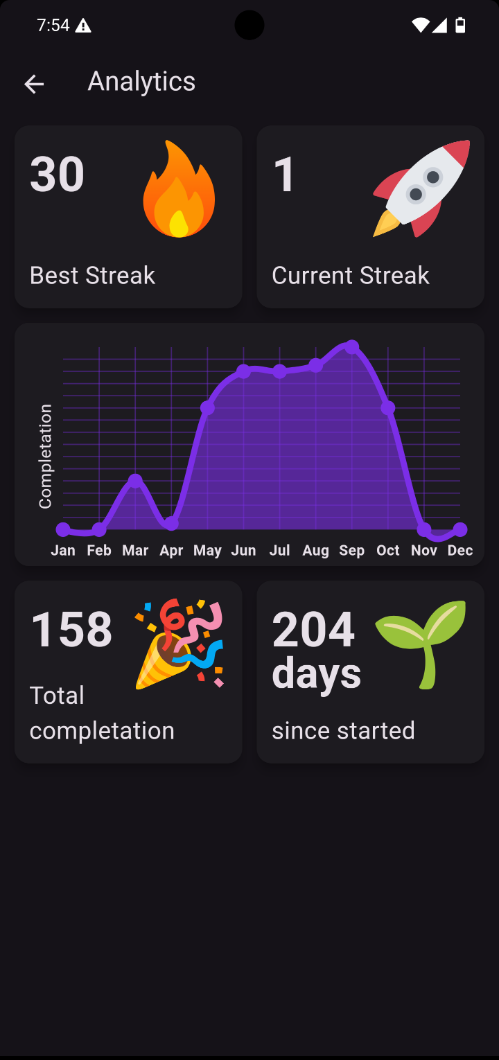 Stay on top of your performance with powerful statistics. Visualize habits progress. Such as Best Streak, Current Streak, Total Completion, Completion per month, Days since started etc.